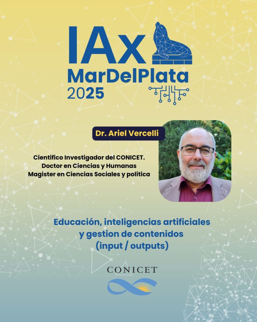 El jueves 30 de octubre, organizado por Global.IA, el Dr. Ariel Vercelli estará participando de #IAxMarDelPlata, una experiencia que busca democratizar el conocimiento sobre inteligencias artificiales. El encuentro reunirá a profesionales de distintas áreas para compartir experiencias y miradas situadas sobre la IA en un contexto puramente marplatense.