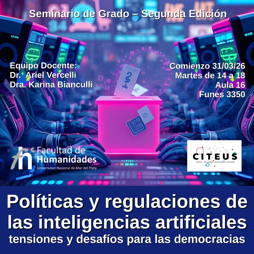 El 31 de marzo de 2026 iniciamos la 2da Edición del seminario sobre “Políticas y regulaciones de las inteligencias artificiales: tensiones y desafíos para las democracias”. El seminario se ofrece para estudiantes de grado de la Facultad de Humanidades, UNMdP. El seminario estará a cargo del Dr. Ariel Vercelli y la Dra. Karina Bianculli. ¡Les esperamos!