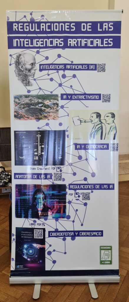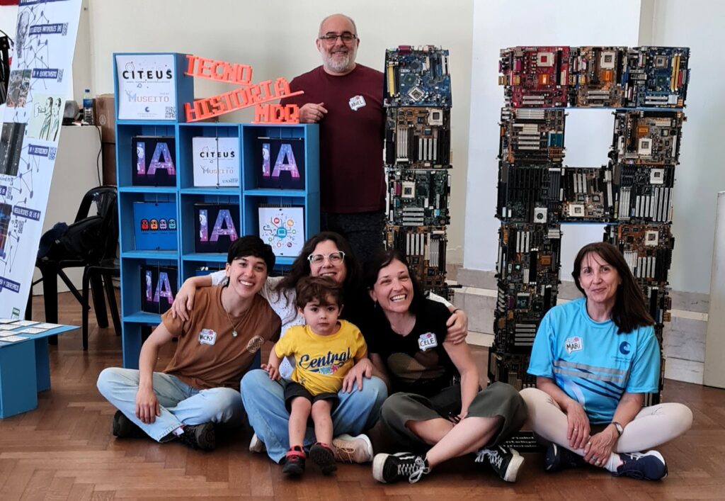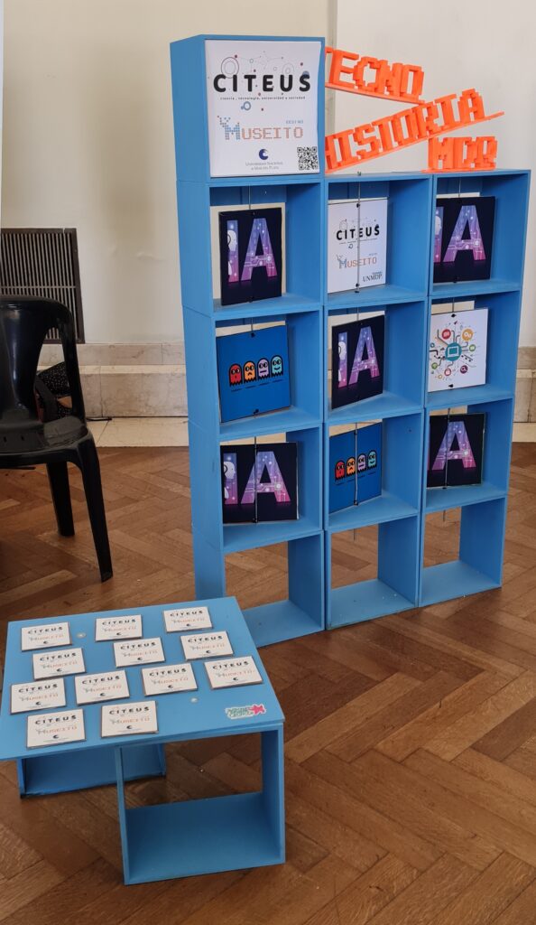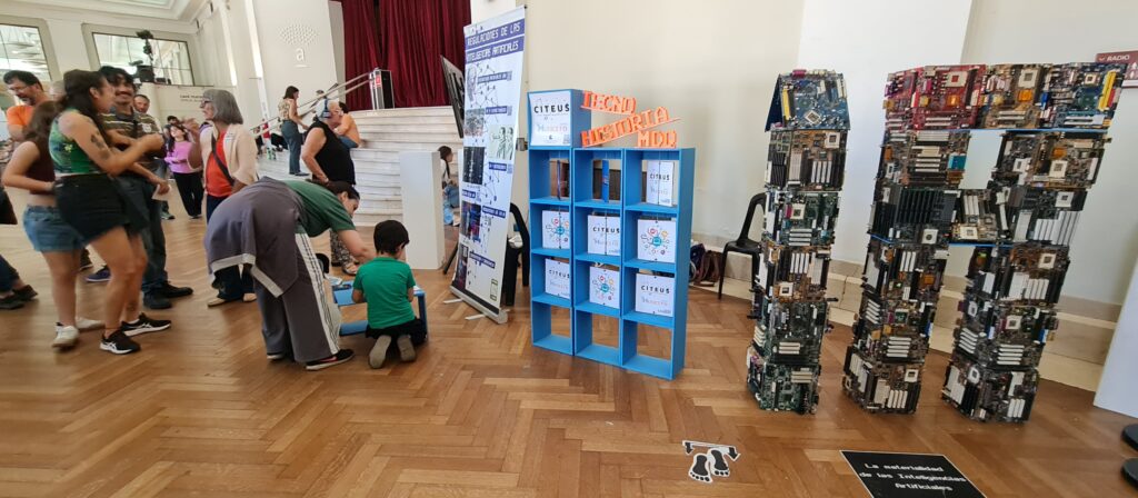 En 2025 el Grupo CITEUS se abocó a construir la instalación Tecno-Historia MDQ con los siguientes componentes que abajo les describimos: una IA (1.80 mt de alto, 1 metro largo x 50 cm de ancho construida con placas de CPU); unos cubos de madera con una ta-te-ti (1,70 de alto x 1 metro de largo por 20 cm de ancho); una pequeña mesa con memotec para las niñeces (50 x 50 y 30 cm de alto); un afiche (2 m de alto por 80cm de ancho) sobre las políticas y regulaciones de las IA con breves audios a través QR; una TV de 46 pulgadas con auriculares inalámbricos donde pasamos en loop pequeños audiovisuales históricos (2/3 minutos) con relatos históricos sobre las historias de la informática. Abajo les compartimos las imágenes y videos de la instalación y las fotos que registran nuestra labor antes y durante el encuentro el día 1 de noviembre.