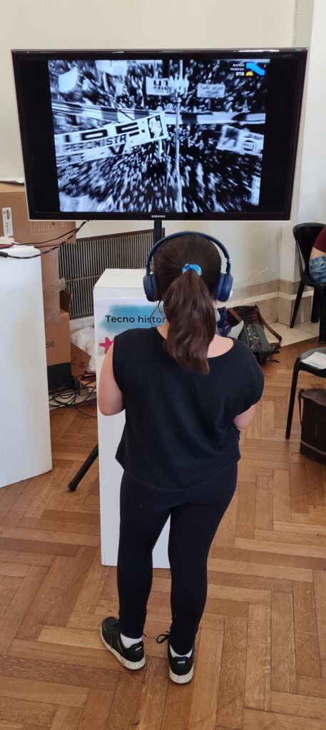 La instalación contó con pequeños videos editados a partir del exhaustivo trabajo de relevamiento de imágenes históricas realizado por Facundo Macías, estudiante de la carrera de historia de la Facultad de Humanidades de la UNMdP, guión de la Dra. Karina Bianculli y la voz de Daniela Ponce Lara (Locutora Nacional C.N 14281 del Instituto Eter Mar del Plata). Los videos que abajo les compartimos proponen un acercamiento a la historia de la informática nacional desde mediados de siglo XX hasta el regreso democrático. A su vez, estos videos fueron diseñados con un discurso directo y amplia riqueza visual para interpelar los saberes previos respecto de la informática en Argentina y América Latina. Quienes visitaron la muestra contaron con auriculares bluetooth de alta fidelidad para acompañar la producción audiovisual.